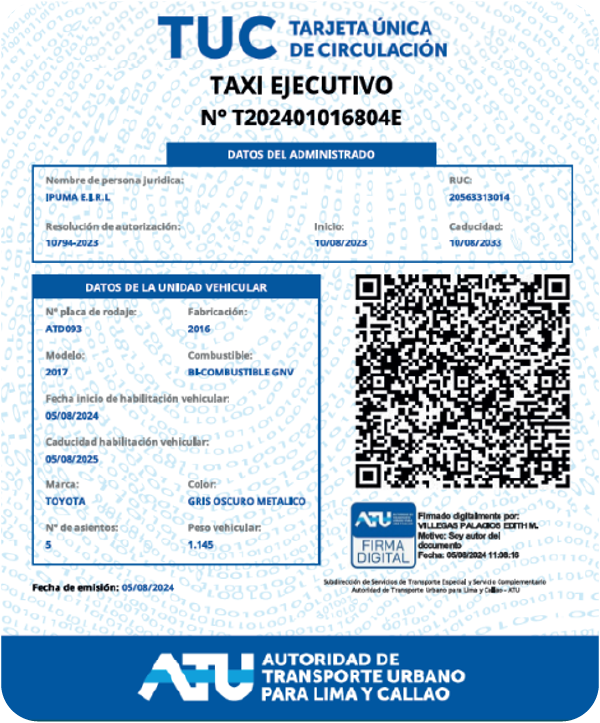 ** Al finalizar con el trámite, se le entrega la Tarjeta Única De Circulación (Permiso del ATU), que tiene cobertura para Lima y Callao